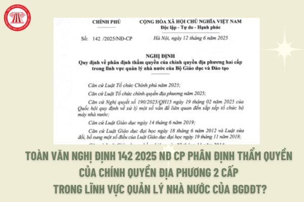 Ngày 12/06/2025, Chính phủ đã ban hành Nghị định 142/2025/NĐ-CP về phân định thẩm quyền của chính quyền địa phương 2 cấp trong lĩnh vực quản lý nhà nước của Bộ Giáo dục và Đào tạo.
