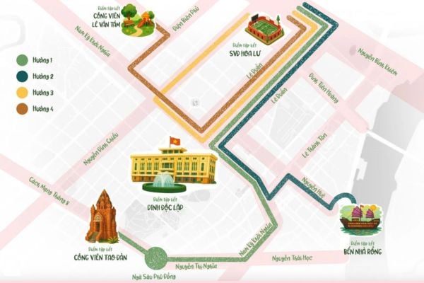 Hướng 1: Sau khi qua Hội trường Thống Nhất, các lực lượng di chuyển theo lộ trình đường Nam Kỳ Khởi Nghĩa - Lê Lợi - Nguyễn Thị Nghĩa - Ngã 6 Phù Đổng Thiên Vương - Cách Mạng Tháng 8. Các lực lượng tại hướng này sẽ tập kết ở Công viên Tao Đàn. Hướng 2: Sau khi qua Hội trường Thống Nhất, các lực lượng di chuyển theo hướng Nam Kỳ Khởi Nghĩa - Lê Thánh Tôn - Nguyễn Huệ - Vòng xoay Mê Linh. Các lực lượng ở hướng này tập kết tại Bến Bạch Đằng. Hướng 3: Sau khi qua Hội trường Thống Nhất, các lực lượng di chuyển theo lộ trình đường Lê Duẩn - Nam Kỳ Khởi Nghĩa - Nguyễn Đình Chiểu - Đinh Tiên Hoàng. Các lực lượng ở hướng này tập kết tại Sân vận động Hoa Lư. Hướng 4: Sau khi qua Hội trường Thống Nhất, các lực lượng di chuyển theo lộ trình đường Nam Kỳ Khởi Nghĩa - Hai Bà Trưng. Các lực lượng ở hướng này tập kết tại Công viên Lê Văn Tám. |